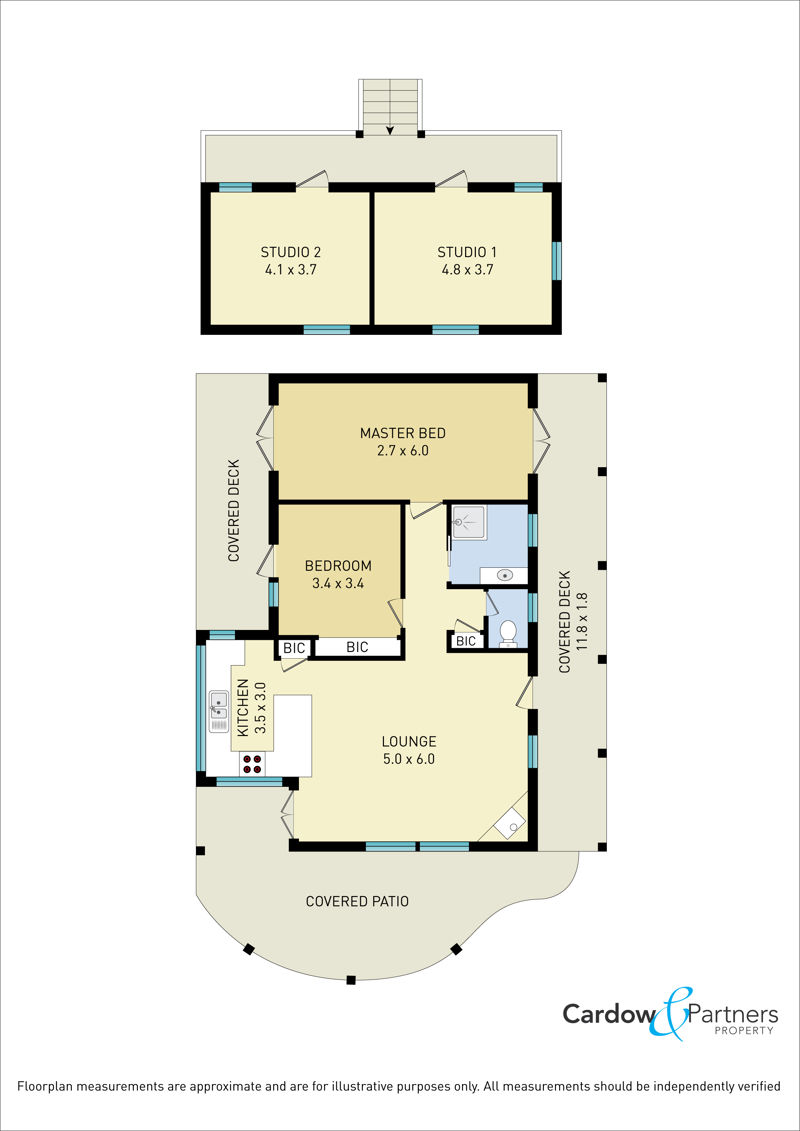 The studio is in a separate location & is built from cedar. It comes with two large rooms, with power, air conditioning, ceiling fans and access to water. Well situated within a surround of cool tree canopies. Ideal for an artist, hobbyist, professional design and consulting office.
